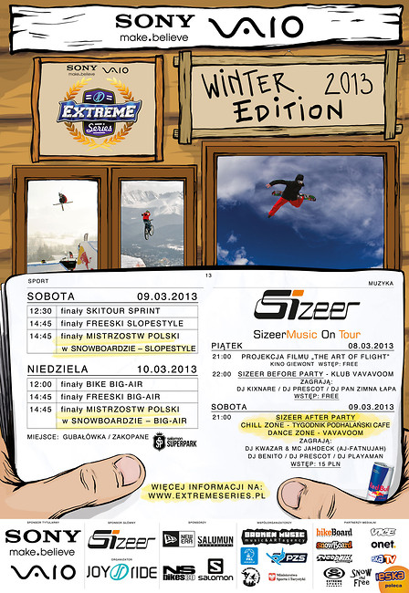 Podczas Sony VAIO Extreme Series Winter Edition nie zabraknie dobrej muzyki! W ramach cyklu Sizeer Music On Tour, już w piątek (08.02.13) , w klubie Vavavoom, na dobry początek zawodów, odbędzie się impreza, podczas której zagrają: DJ Kixnare, DJ Prescot, DJ Pan Zimna Łapa. Dzień później, Vavavoom połączy siły z Tygodnik Podhalański Cafe i razem stworzą niezapomniane after party. Przez całą noc Tygodnik będzie serwował projekcie filmów o sportach ekstremalnych. Równolegle po drugiej stronie ulicy będzie trwał taneczny szał Sizeer Music On Tour przy dźwiękach takich artystów jak: DJ Kwazar & MC Jahdeck, DJ Benito, DJ Prescot i DJ Playaman.